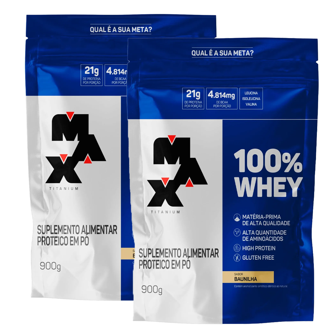O 100% Whey da Max Titanium é um suplemento proteico de alta qualidade, formulado com whey protein concentrado, oferecendo excelente valor biológico e absorção eficiente. Ideal para hipertrofia, recuperação muscular e melhora no desempenho esportivo. Este kit contém 2 unidades de 900g, proporcionando um ótimo custo-benefício.