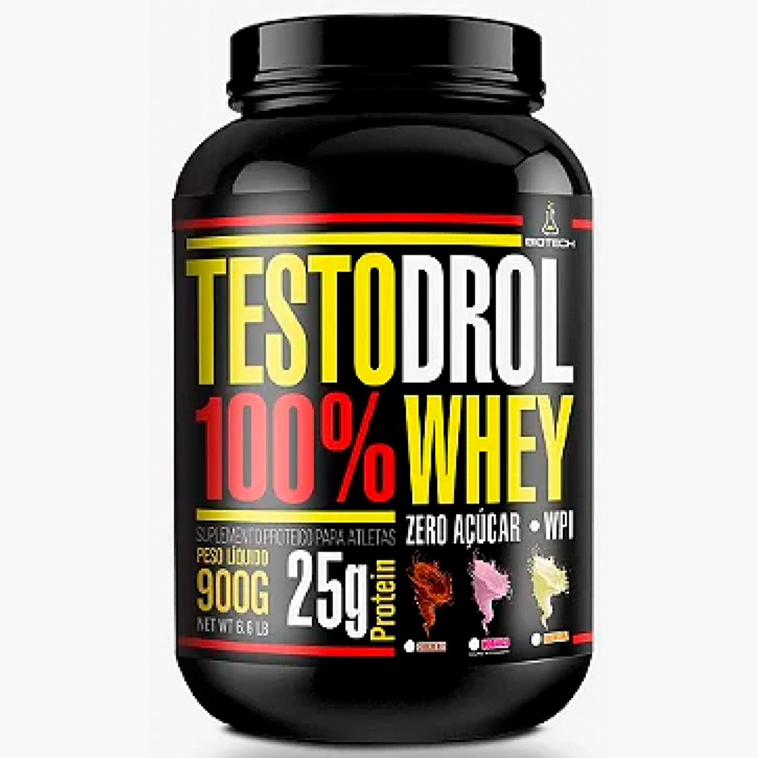O Testodrol 100% Whey Protein 900g da Biotech, um suplemento proteico de alta qualidade desenvolvido para auxiliar no ganho de massa muscular e aprimorar o desempenho nos treinos.